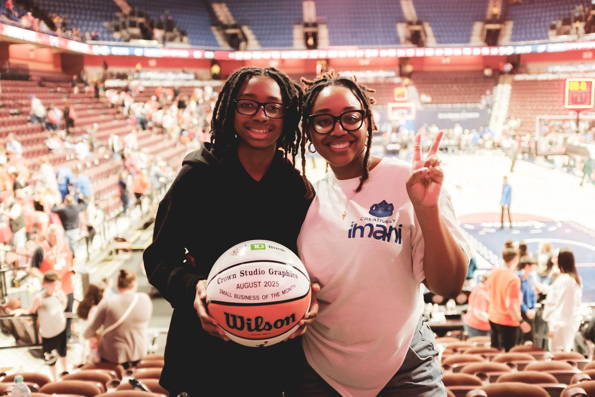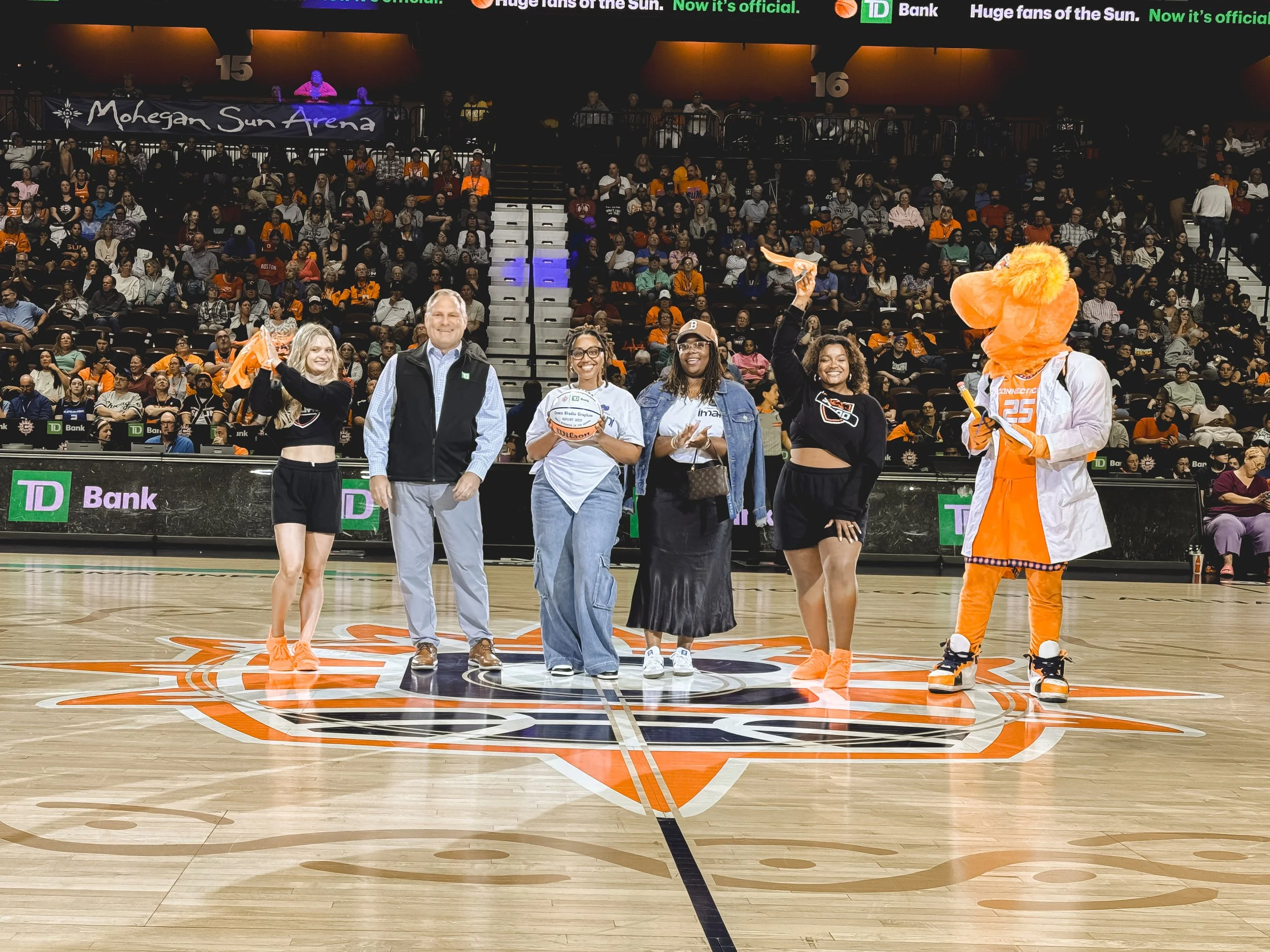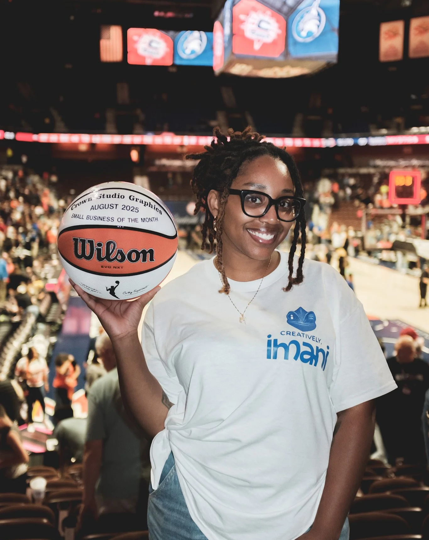 Honored center court during a WNBA Connecticut Sun game as Small Business of the Month, recognizing my work as Founder and Designer of Crown Graphics Studio (now Creatively, Imani).